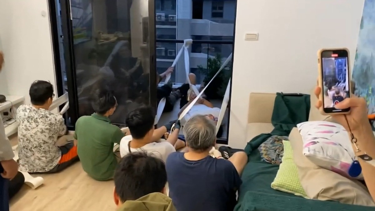 竹北一帶大樓林立,民眾玻璃陽台快被風吹走,與颱風上演「拔河競賽」。(圖/東森新聞)