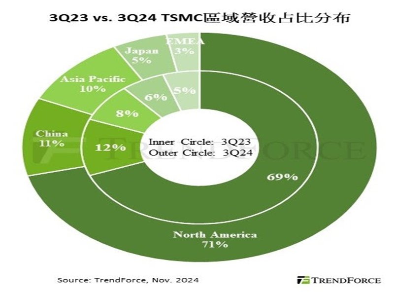 觀察2024年前三季TSMC製程營收分布情況,先進製程佔比67%,已成為其主要營收來源。然而,TrendForce指出,7/6nm、5/4nm及3nm目前主要客戶皆為歐美系及台系客戶,因此即使該審查發酵,雖然可能流失部分中國客戶,但預期可透過其他客戶彌補,對其先進製程產能利用率的影響有限。