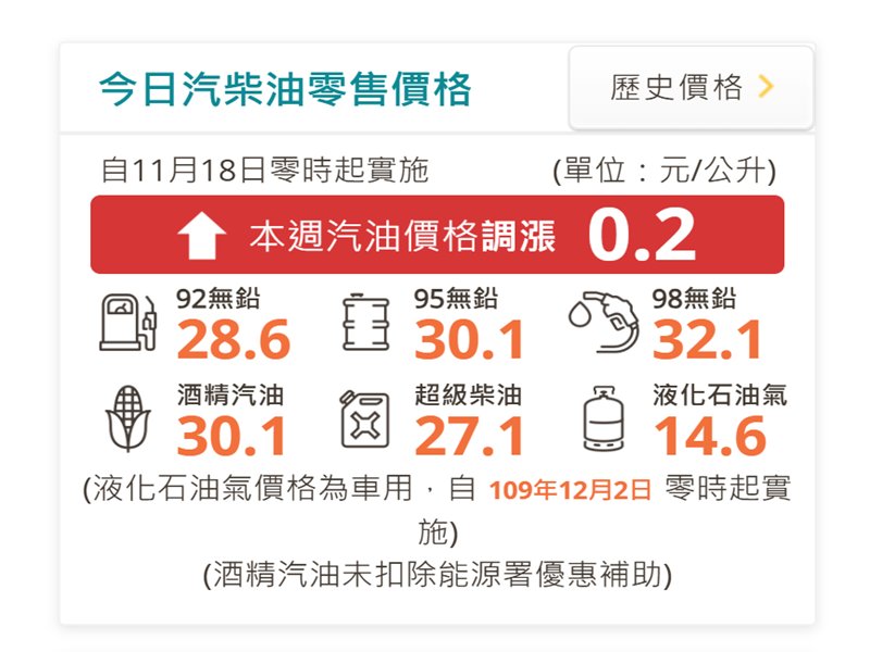 台灣中油宣布,自明(18)日凌晨零時起汽、柴油價格各調漲0.2元及0.3元,參考零售價格分別為92無鉛汽油每公升28.6元、95無鉛汽油每公升30.1元、98無鉛汽油每公升32.1元、超級柴油每公升27.1元。本週因平穩雙機制啟動,汽、柴油各吸收0.8元及0.9元。