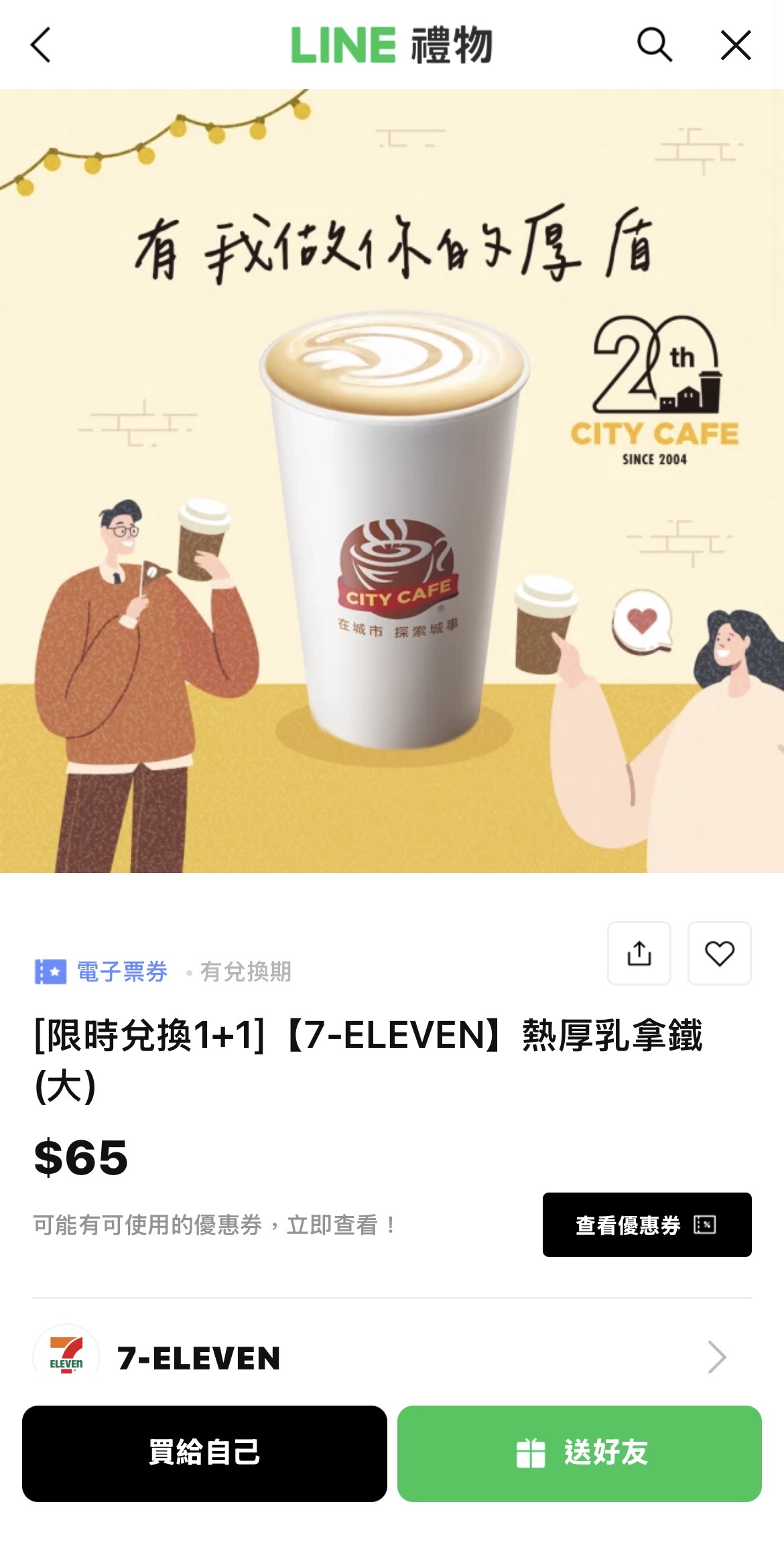7-11在LINE禮物推出「限時兌換1+1」優惠活動,票券銷售期間自即日起至11月30日止,並需在12月20日之前於各門市使用。活動商品包括大杯熱厚乳拿鐵、大杯冰精品美式和大杯精品馥芮白。不過,須注意的是,此優惠不適用於台鐵門市、部分學校、廠辦、商場門市,以及離島門市,且無法與其他促銷活動併用。