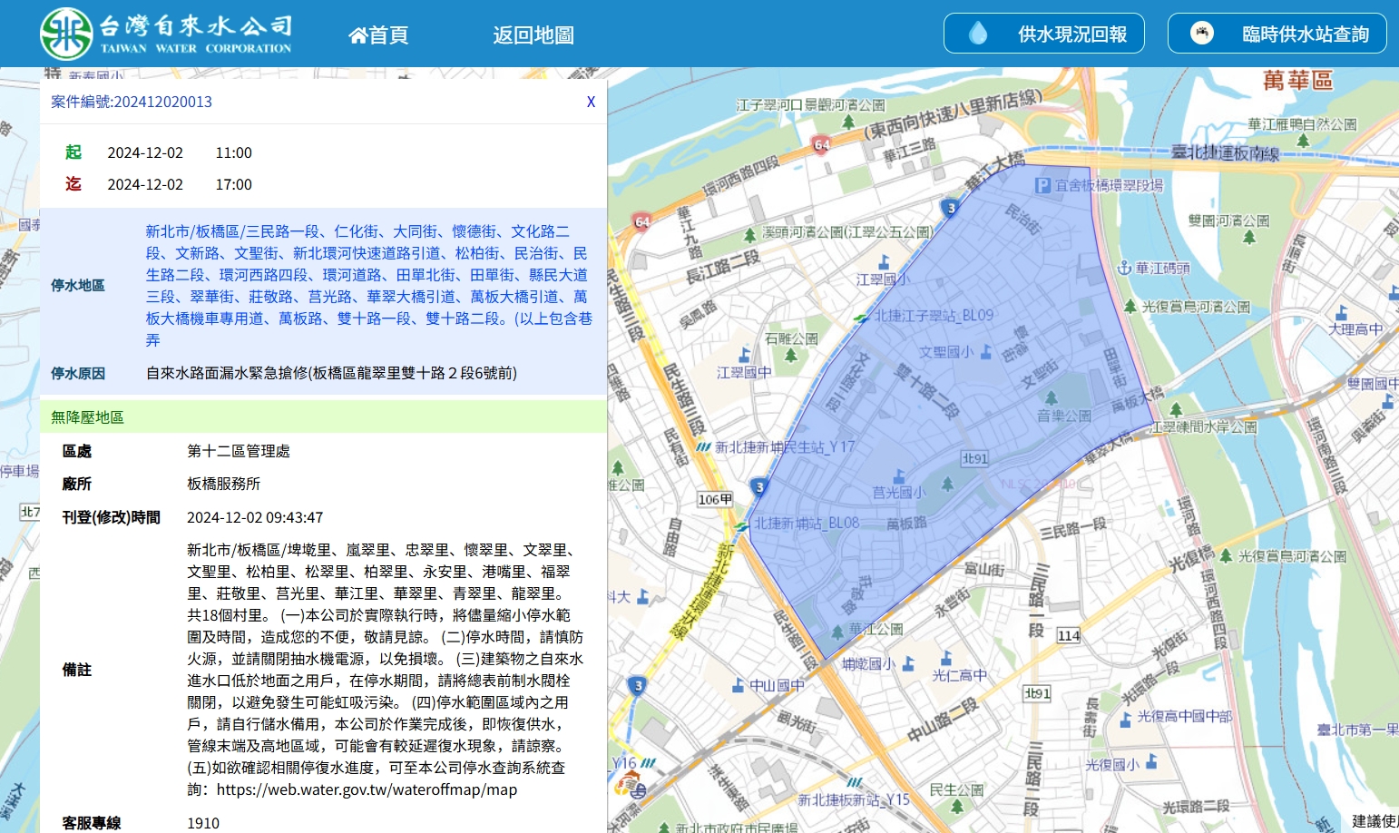 12/2新北板橋停水地區。(圖/翻攝自自來水公司官網)