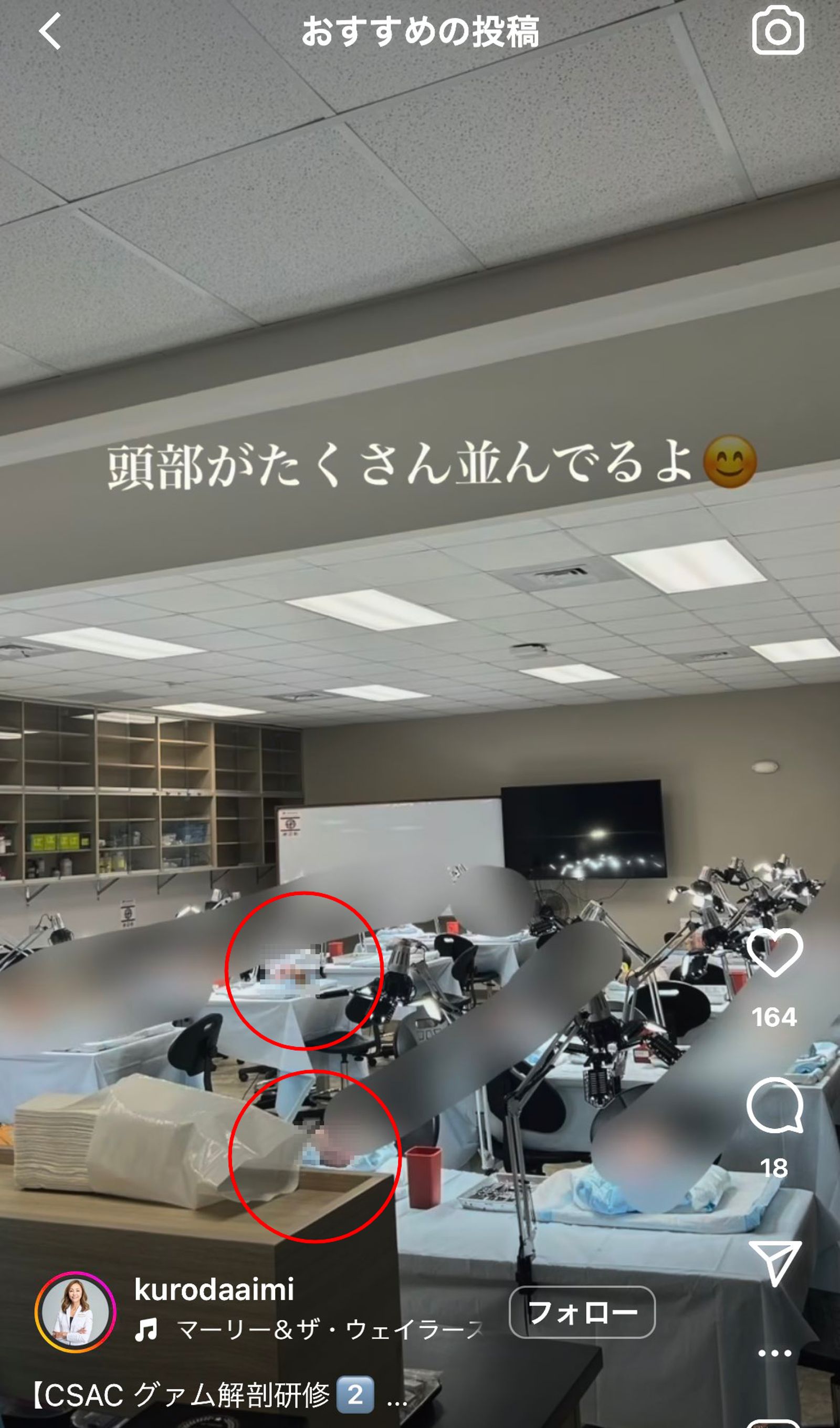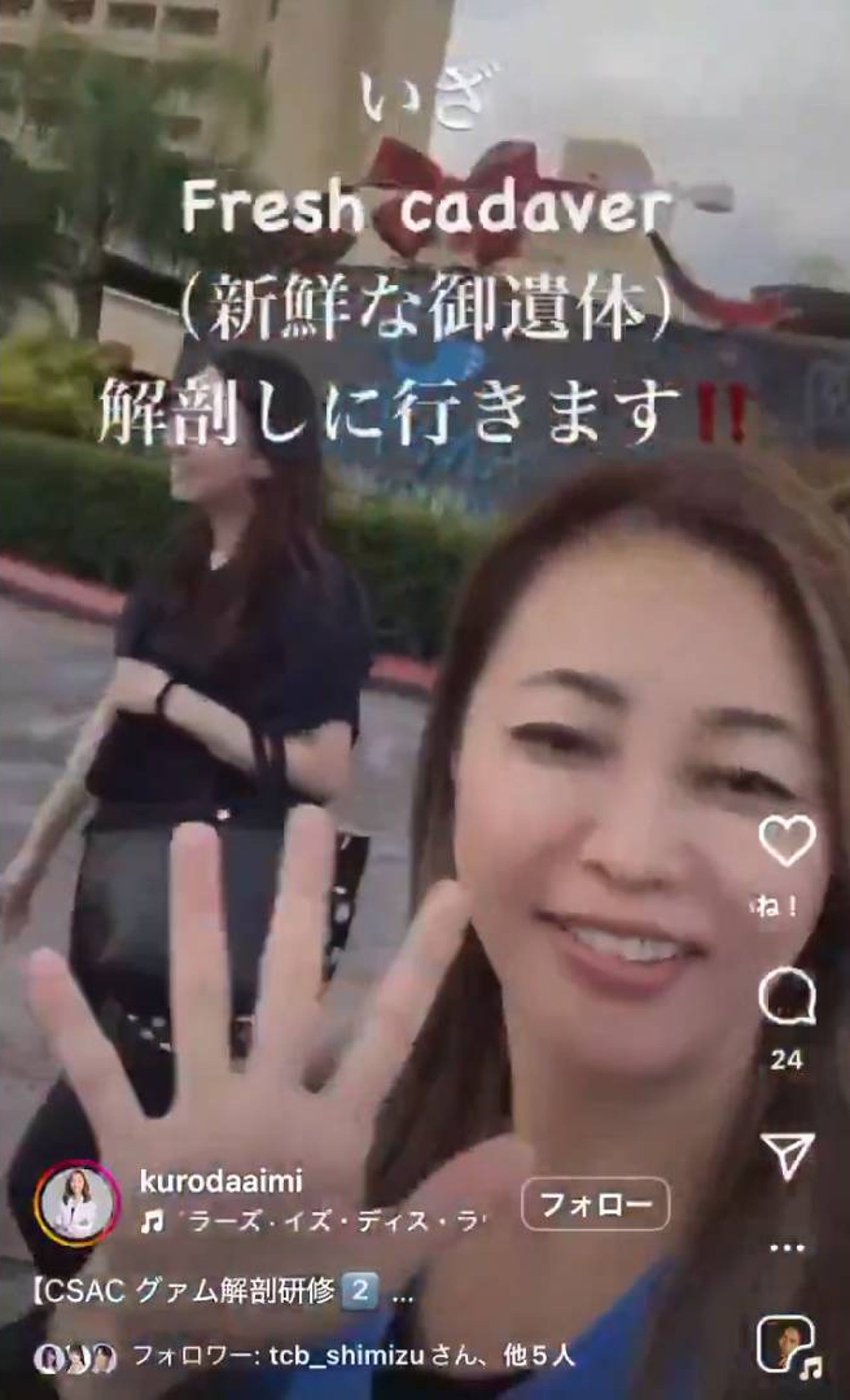 黑田愛美本月23日透過社群媒體IG發布了跟「解剖」有關的影片,原來當天她與其他醫生們要去上解剖研修的課程,她寫下「走吧,一起去解剖新鮮的遺體」,配上輕快音樂似乎有些微和,抵達研修地點後,而接著她直接po實驗室內的遺體照和解剖器具,寫下「有很多頭顱排在一起呦!(笑臉表情符號)」,引發討論。