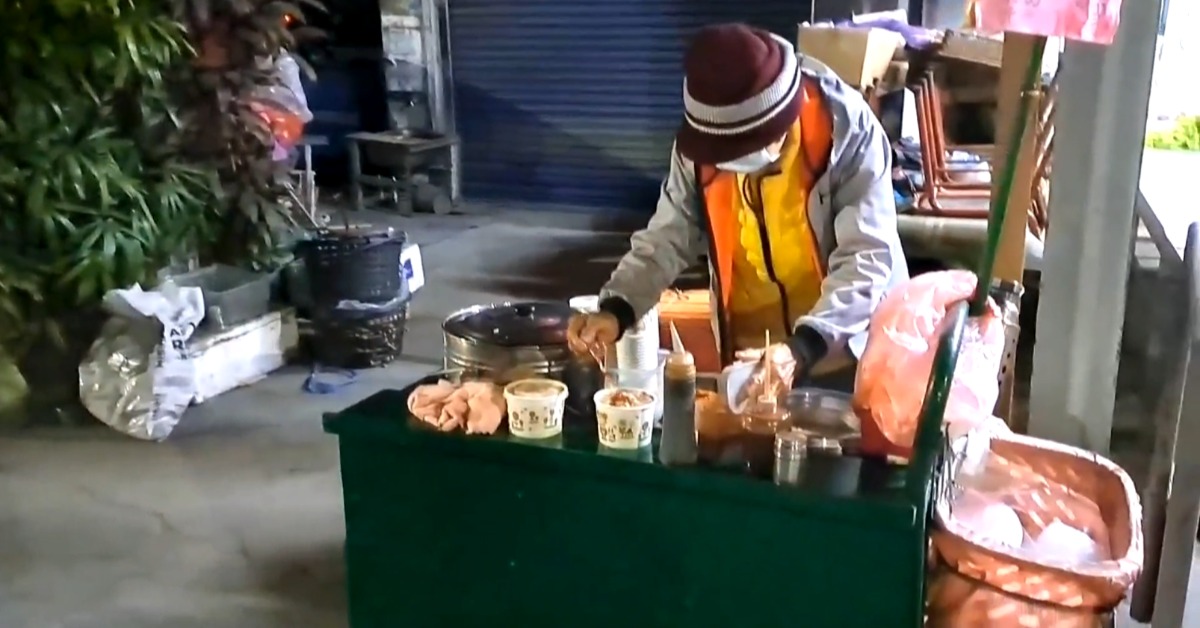 73歲的鹹粥嬤戴著毛帽背心,全身包緊緊,冒著寒冷的低溫,天還沒亮,清晨五點多就推著攤車出來擺攤,賣鹹粥和麵線,因為她一心掛念著人被關在大陸的孫子,希望能籌到旅費見他一面。