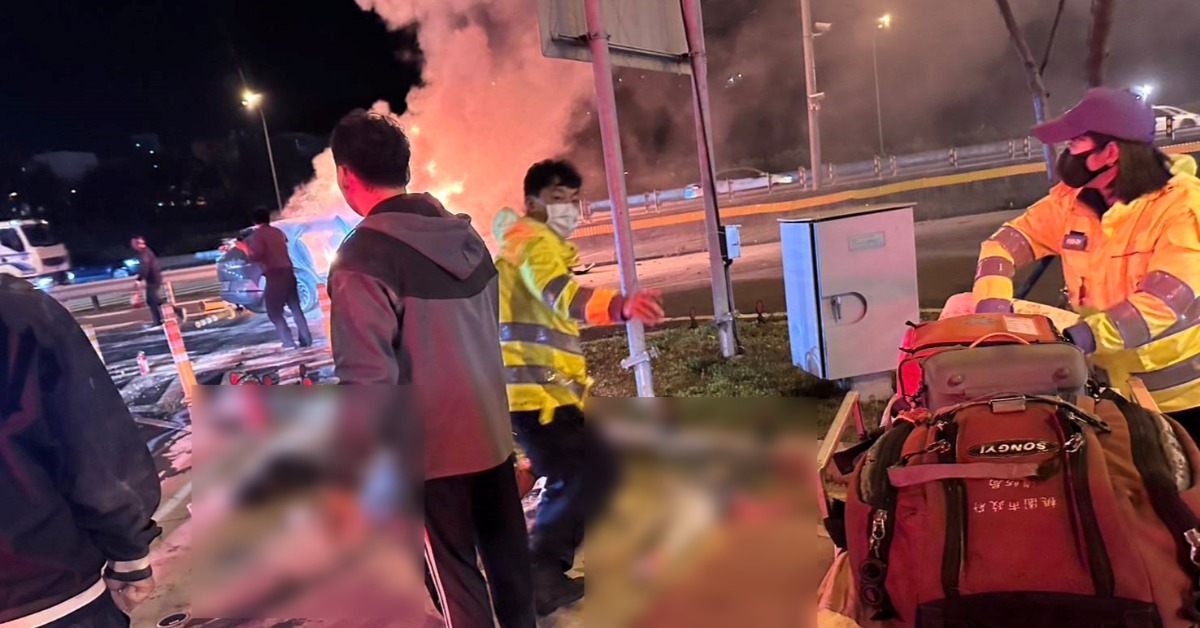 楊梅休息站旁25日晚間發生電動車自撞起火,慘釀2死2命危4傷事故。(圖/東森新聞)