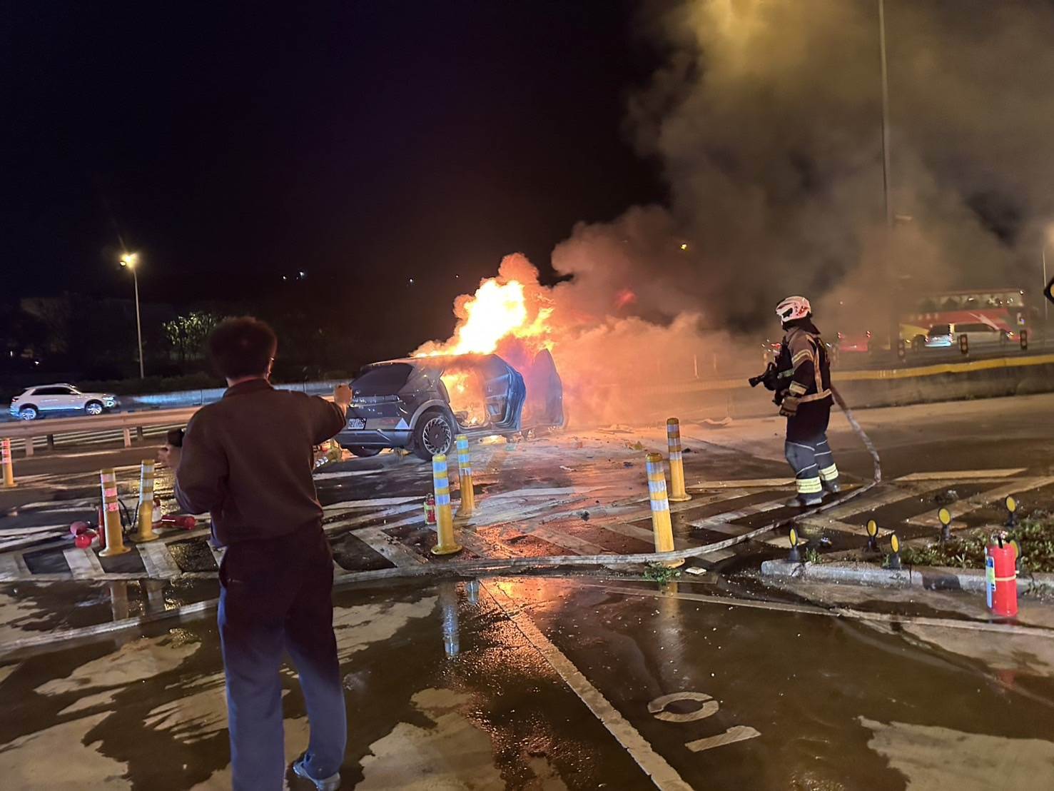 目擊者表示,電動車在撞擊後,火勢迅速從車頭向車尾蔓延,車輛也很快被火勢吞沒,根本看不出車內有沒有人,而一旁超商店員見狀,立刻拿出滅火器滅火,休息站內其他民眾也上前救人。另名參與救援民眾表示,電動車爆炸時的震波,連他停在休息站內的車子也會晃動。
