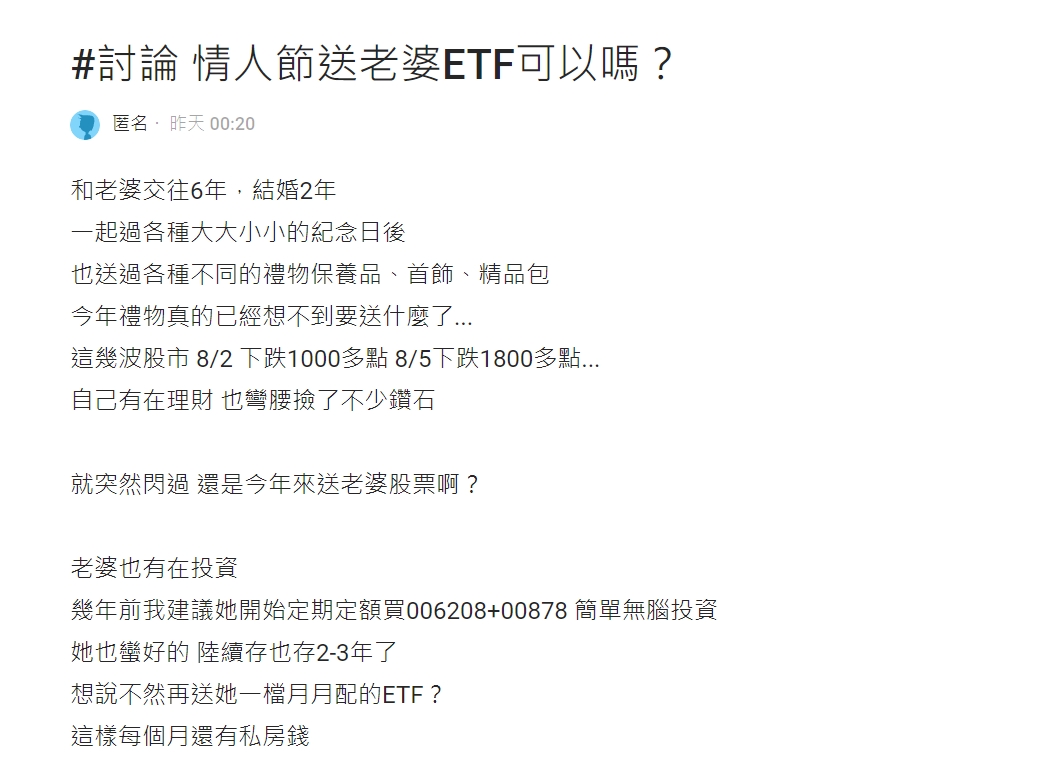 一名男網友在Dcard上發文詢問「情人節送老婆ETF可以嗎」,表示自己和老婆交往6年、結婚2年 ,一起過了各種大大小小的紀念日後,早已送過各種不同的禮物,像是保養品、首飾、精品包,讓他苦惱「今年禮物真的已經想不到要送什麼了」。