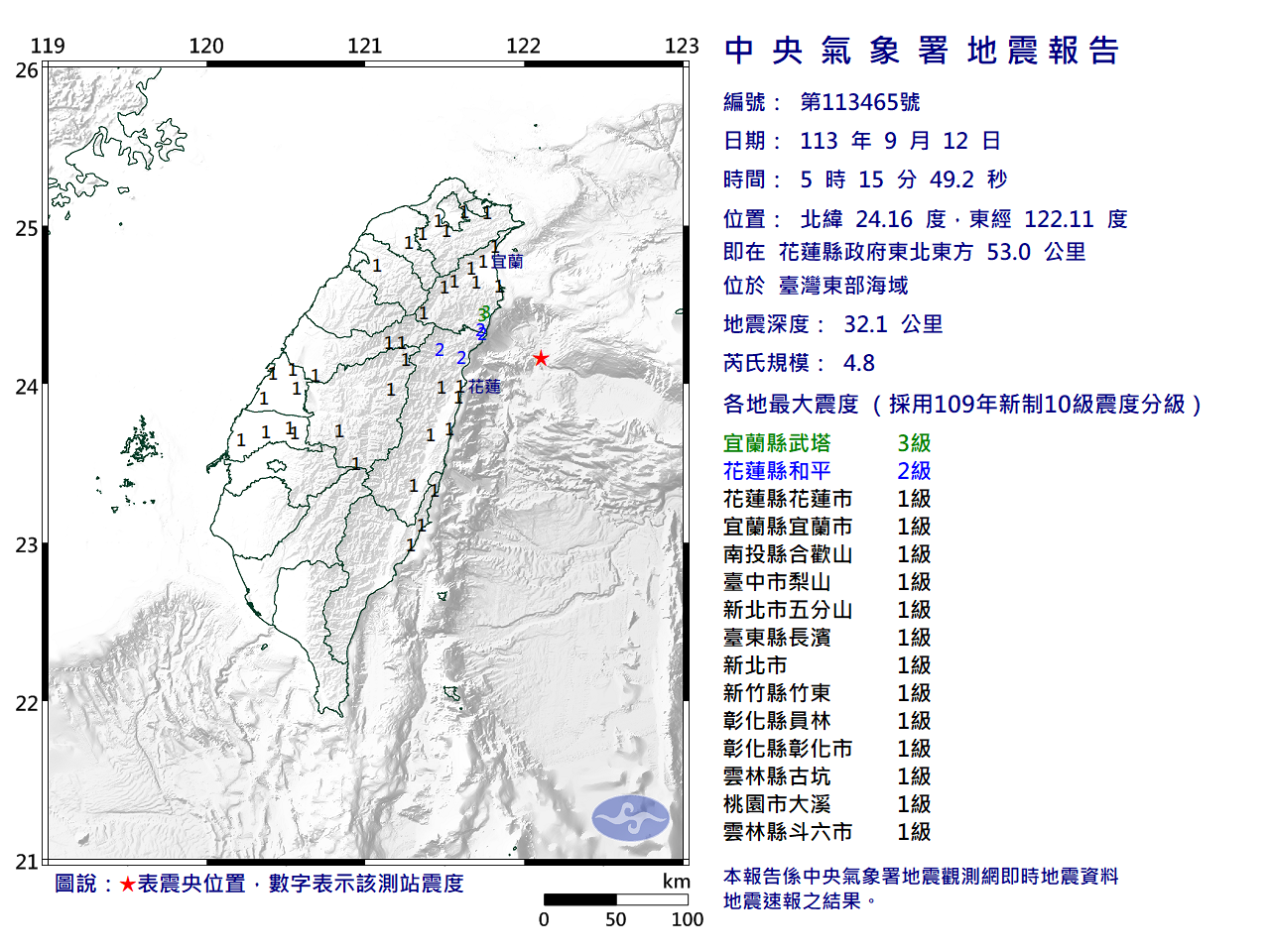 中央氣象署發布顯著有感地震最新消息,今(12)日5時15分,發生芮氏規模4.8有感地震,震央位置在花蓮縣政府東北東方 53.0 公里 (位於臺灣東部海域),震源深度32.1公里。