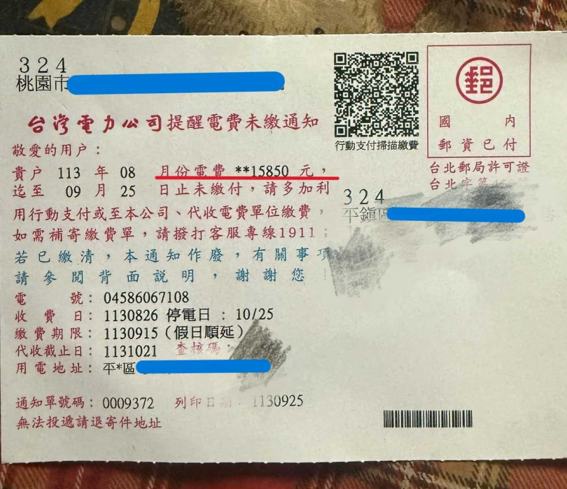 一名網友就分享自己收到最新一期的電費帳單,金額高達1萬5850元。(圖/CTWANT)