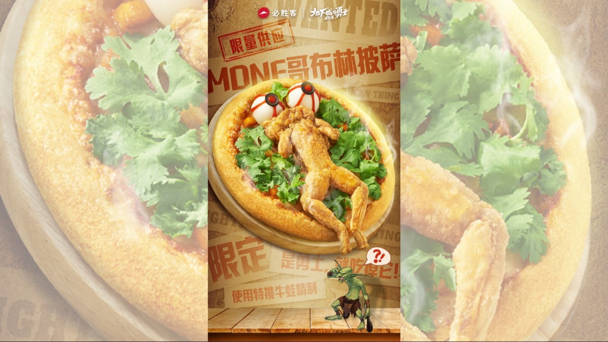 台灣知名速食品牌「必勝客」,經常推出令人驚豔的創新披薩,如「芝心雙粿草仔龜披薩」和「呷霸王紅糟肉圓比薩」等,每次的新品都引起廣泛關注。如今,就連大陸必勝客也跟著推出創意新品「哥布林披薩」。從宣傳照可見,披薩上放了一整隻牛蛙,搭配番茄醬製成的「眼球」作裝飾,無論造型還是口味都引發熱議。