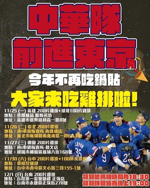 2024世界棒球12強賽中華隊表現亮眼,奪下冠軍,以4比0完封27連勝的日本隊。比賽結束後,不少「祭品文」開始兌現。知名前職棒球員、知名棒球YouTube「豹子腿」方昶詠將送出上千份雞排,還加碼飲料。