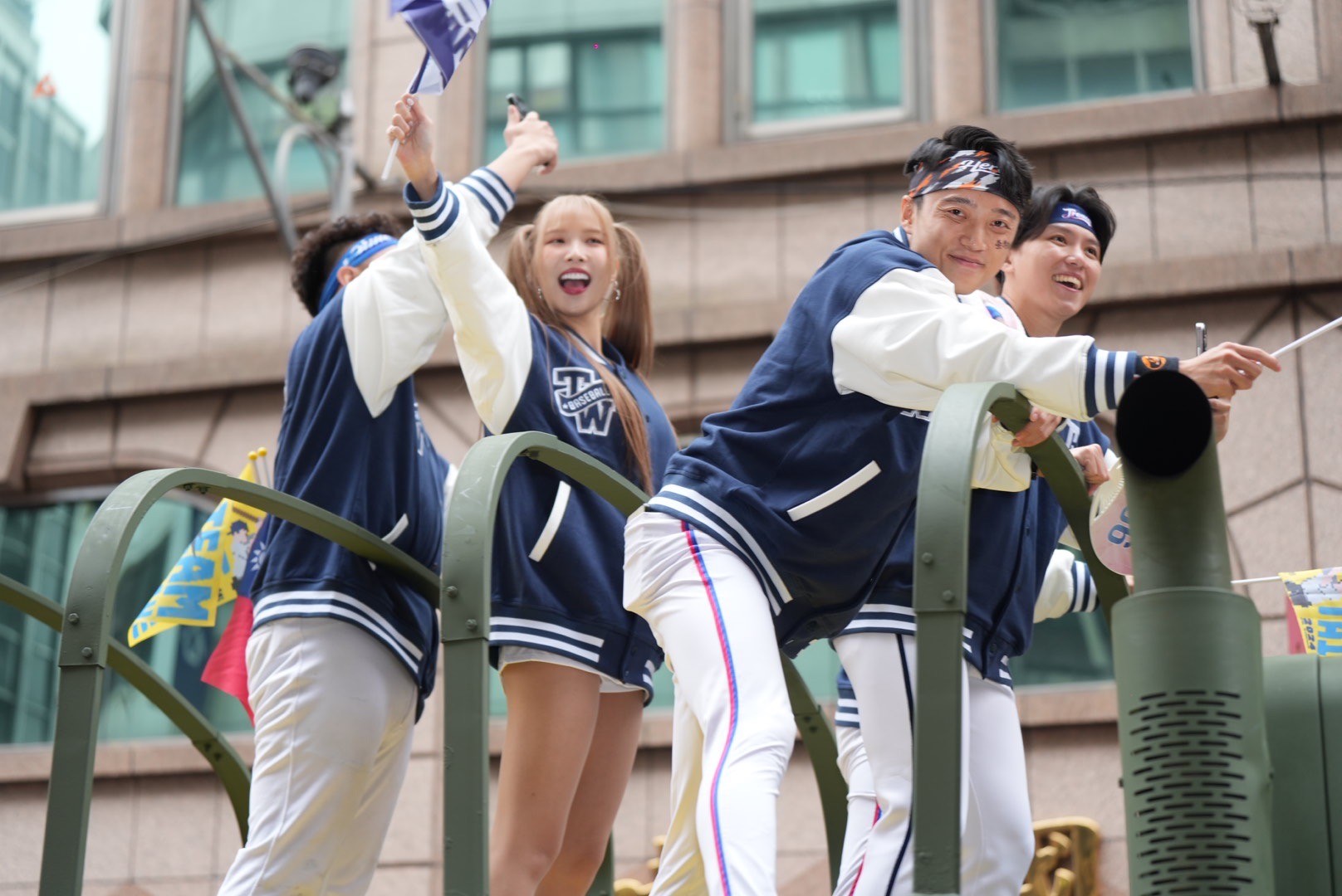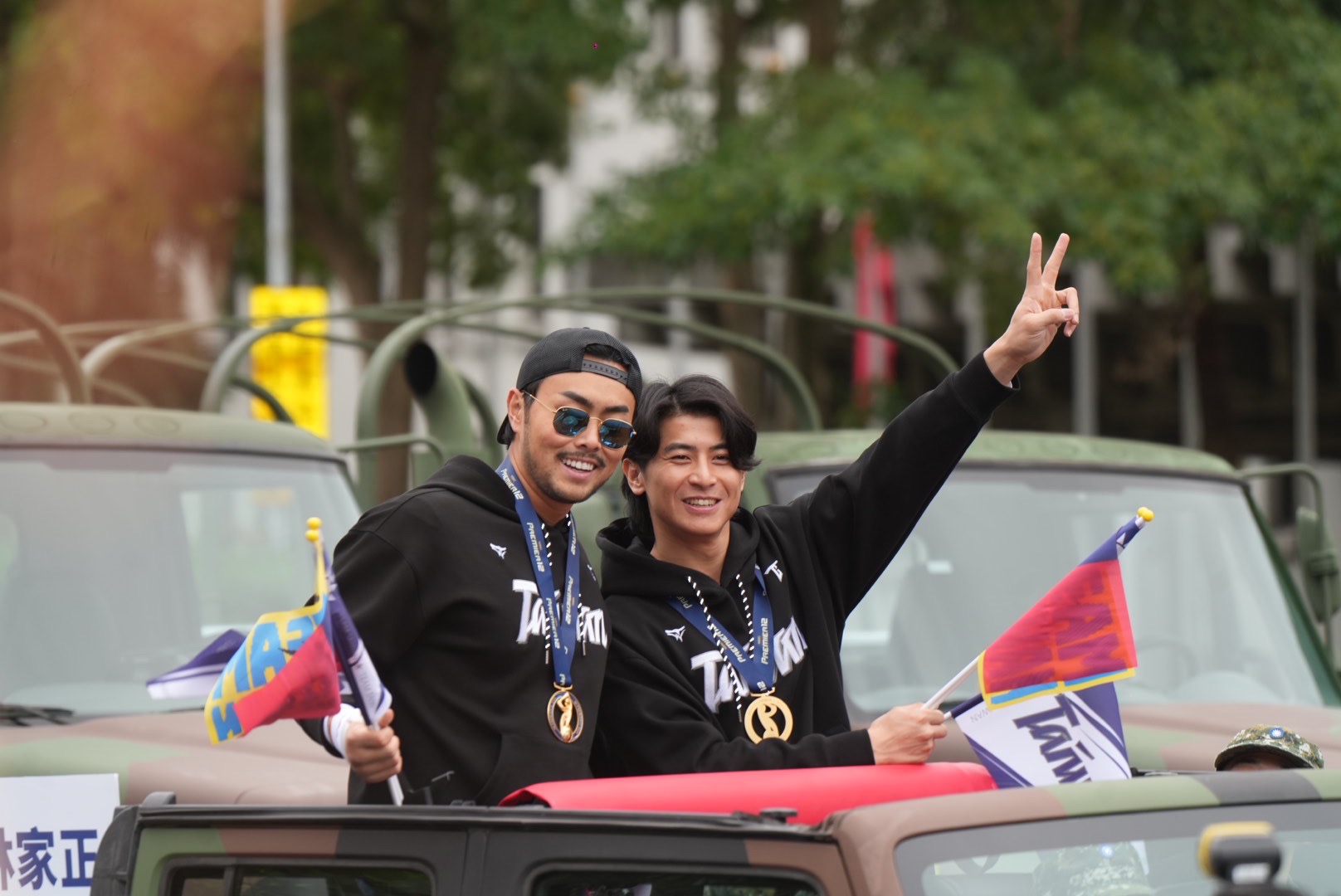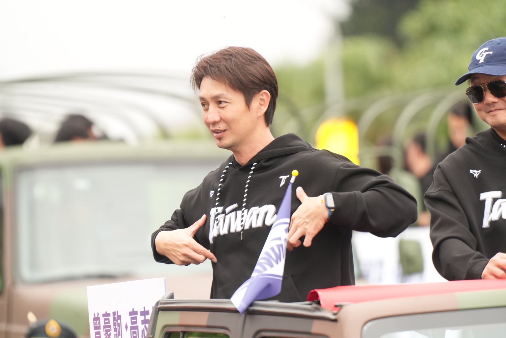 總計30車的大車隊由「龍貓教練」曾豪駒打頭陣,「台灣隊長」陳傑憲、投手教練王建民等人,也帶著燦爛的笑容揮手與民眾致意,兩旁民眾也爆以熱烈歡呼何掌聲。張政禹的招牌「ALL IN」手勢更是嗨爆群眾。親自到東京加油的應援團,也搭乘戰車迎接球迷的熱情歡呼。超親民的龍貓教練不只揮手與民眾致意,還幫女警簽名,展現十足暖力。