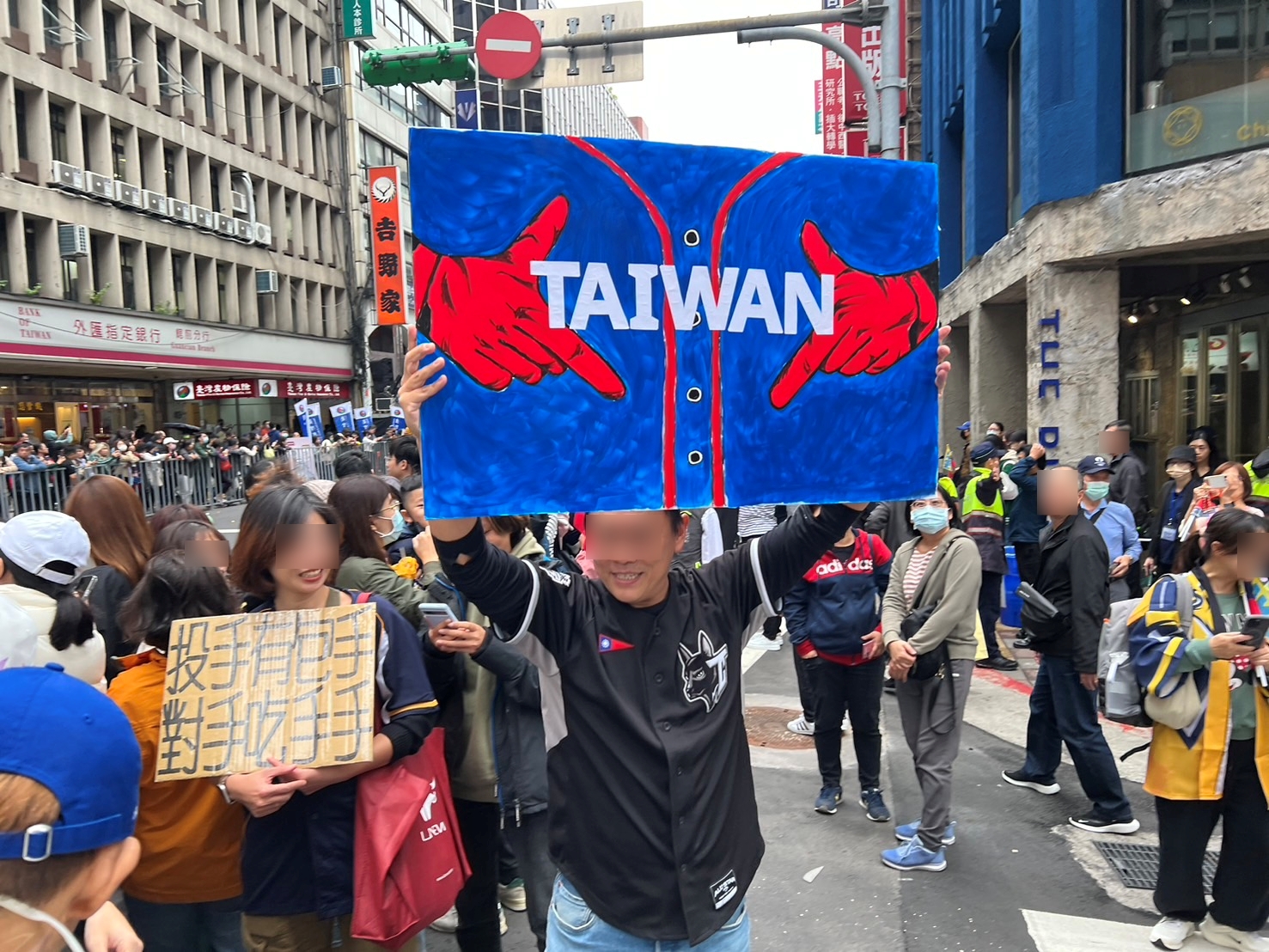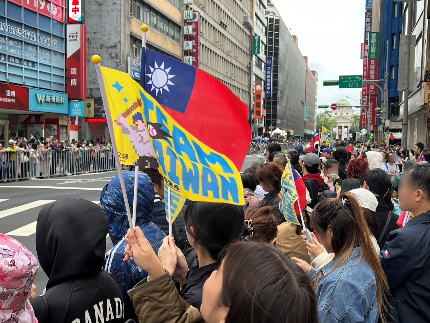重慶南路上等待的民眾,也不斷揮舞手中小物,準備迎接英雄們到場,民眾也唱起應援曲一起Team Taiwan。