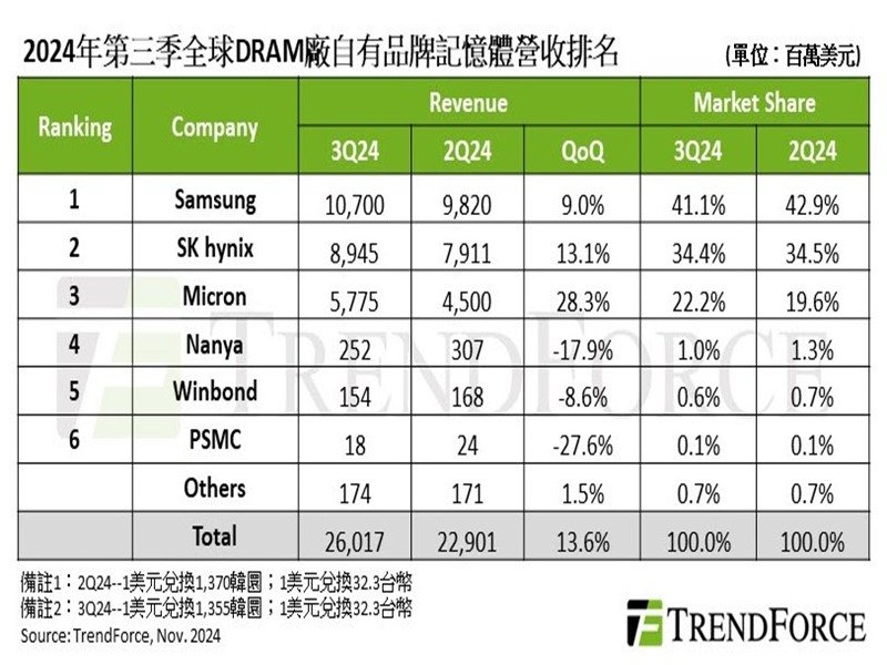根據TrendForce最新調查,2024年第三季DRAM產業營收為260.2億美元,季增13.6%。受到大陸手機業者去化庫存和陸系DRAM供應商擴產影響,前三大DRAM原廠LPDDR4及DDR4出貨量下降,但供應資料中心的DDR5及HBM需求上升。平均銷售單價部分,三大原廠延續前一季的上漲氛圍,加上HBM持續排擠整體DRAM產能,合約價於第三季達成8%至13%的漲幅。