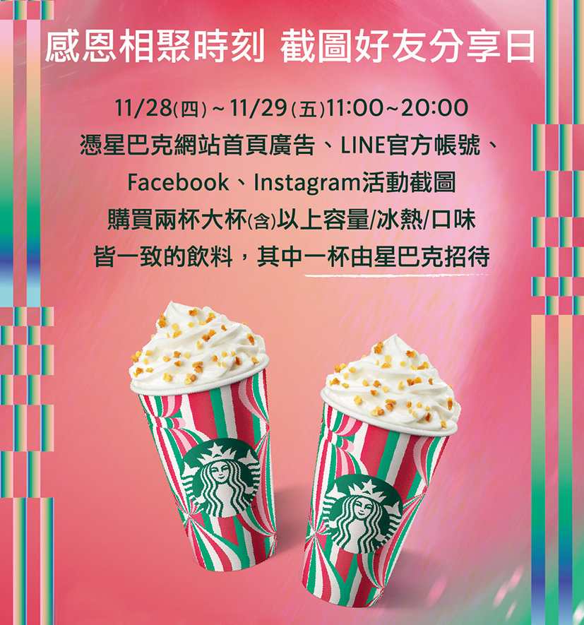 星巴克明(28日)起至29日推出「感恩相聚時刻 一起截圖喝咖啡 好友分享日」,憑星巴克網站首頁廣告或官方社群平台活動截圖,於早上11時至晚間8時至全台星巴克門市,購買兩杯大杯(含)以上容量/冰熱/口味皆一致的飲料,其中一杯由星巴克招待。每人每次至多買二送二,限當場一次領取,部分飲品及門市不適用,詳細活動辦法依星巴克網站公告為主。