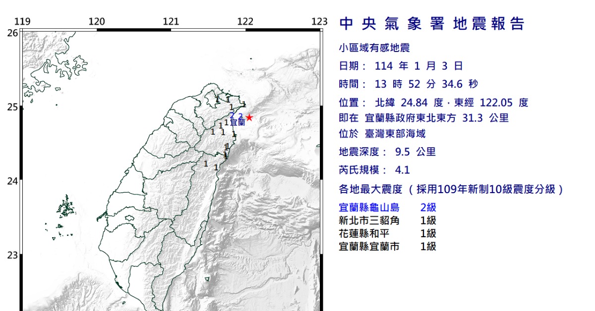 根據中央氣象署詳細地震報告,今日13時52分發生有感地震,震央位於北緯 24.84度,東經 122.05度即在宜蘭縣政府東北東方 31.3 公里,地震深度9.5公里,芮氏規模4.1。