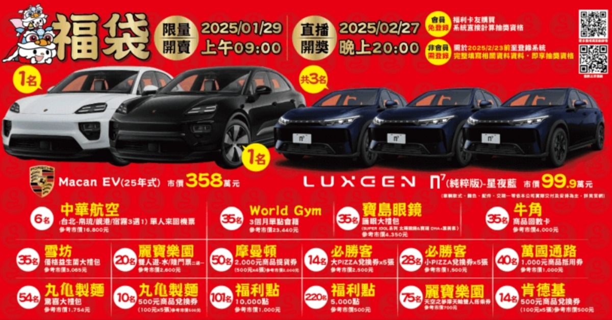 為了迎接新春,全聯福利中心今(15日)推出了全新的「2025蛇年福袋」活動,並公布福袋的驚喜獎品。大獎包含5台名車,2台市值358萬的「PORSCHE Macan EV純電動休旅車」以及3台99.9萬「LUXGEN n⁷純電動休旅車」,福袋將於1月29日9:00正式開賣。此外,店內還推出了買一送一的優惠活動,讓民眾可以選購更多心儀的商品。