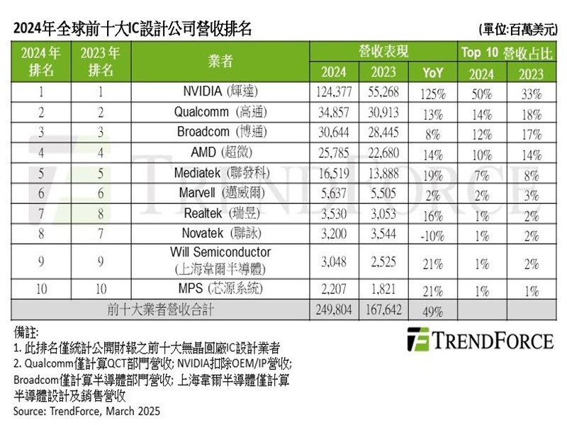 TrendForce:2024年全球前十大IC設計業者營收合計年增49% NVIDIA囊括半數占比