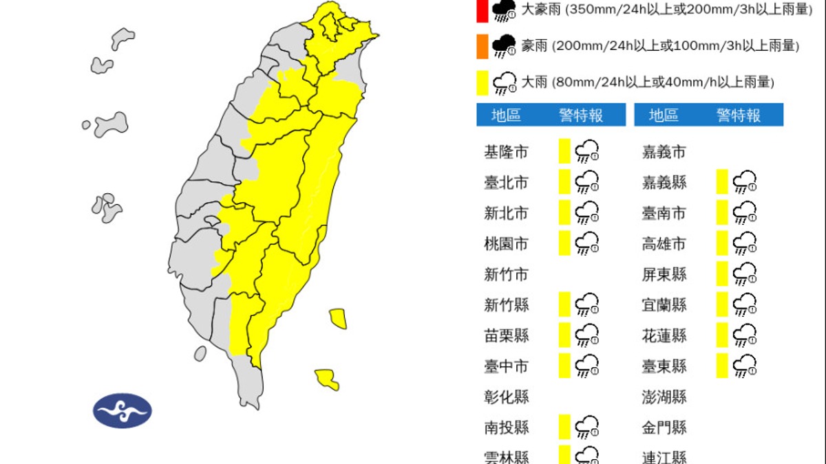今天(10日)下午2點20分,中央氣象署發布大雨特報,雙北、東部、東南部地區等16縣市警戒,提醒民眾注意防範大雨。