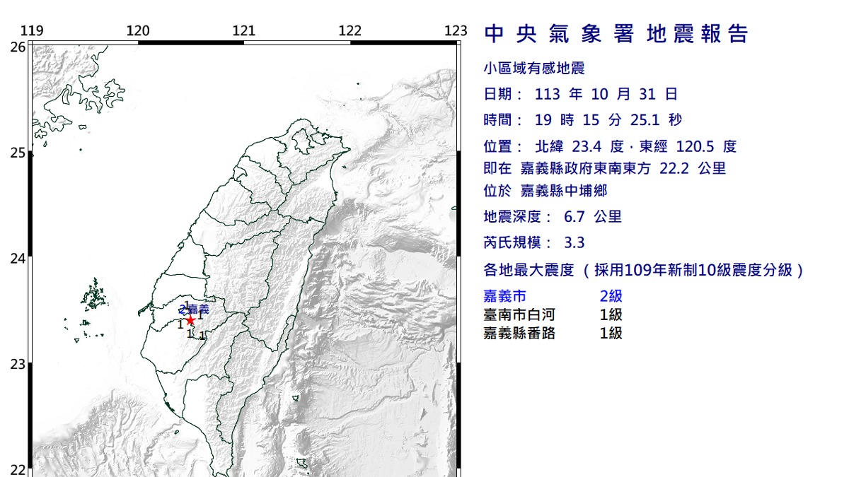 中央氣象署表示,19時15分發生小區域有感地震,震央位於北緯 23.4度,東經 120.5度,即在嘉義縣政府東南東方 22.2 公里,深度6.7公里,芮氏規模3.3。
