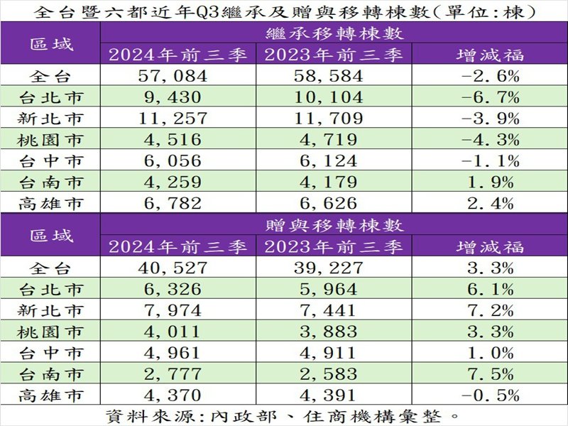 據內政部數據,全台2024年前三季繼承移轉棟數達5萬7084棟,與去年同期相比,減少約2.6%。賴志昶分析,全台繼承移轉量體雖說呈現減幅,但仍處相對高檔,為自1991年有統計以來僅次於2023年的歷年次高,其中雙北依然是繼承移轉量的冠、亞軍,主因為雙北土增稅驚人,致使長輩多會透過繼承移轉,來達成節稅效果,也讓兩大都會區「等房族」數量較多。