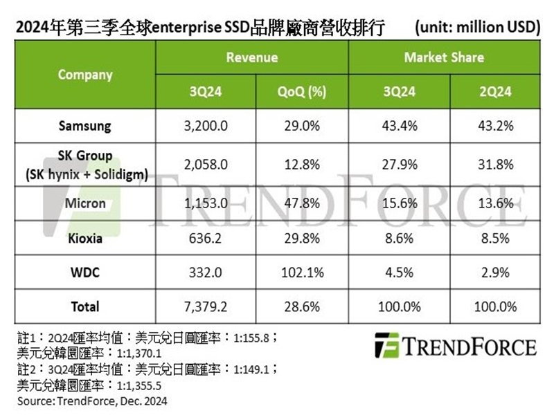 排名第二的SK Group(含SK hynix 與Solidigm)憑藉全系列滿足AI儲存需求產品,於第三季再創出貨新高,帶動enterprise SSD營收達20.58億美元。第四季由於新一代採用SK 176層TLC PCIe 5.0產品量產,加上原有Solidigm 144層TLC PCIe 4.0及大容量QLC SSD,SK海力士集團營收可望維持前一季水準。