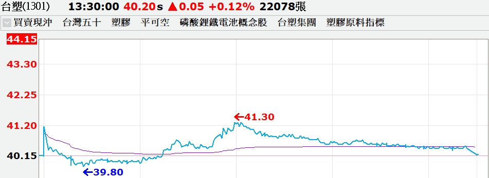 台塑(1301)近期面臨4字頭保衛戰,儘管於上週五公布11月營收,繳出年月雙增,且皆逾10%的好成績,不過今日股價卻一度跌破40元,最低下探39.8元,不過隨即出現低接買盤承接,股價也逐步墊高,一度拉抬至41.3元,終場則以40.2元作收,漲0.05元,漲幅0.12%。