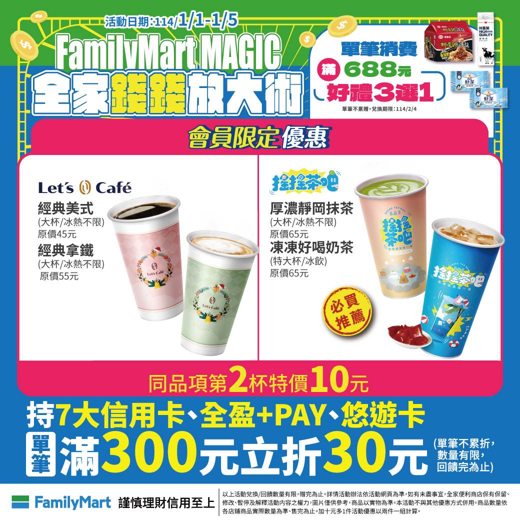 全家門市限定優惠只到今日,優惠品項包括大杯美式、大杯拿鐵、大杯厚濃靜岡抹茶拿鐵、特大杯凍凍好喝奶茶第2杯10元、以及中杯單品咖啡任2杯99元、大杯單品咖啡任2杯119元。