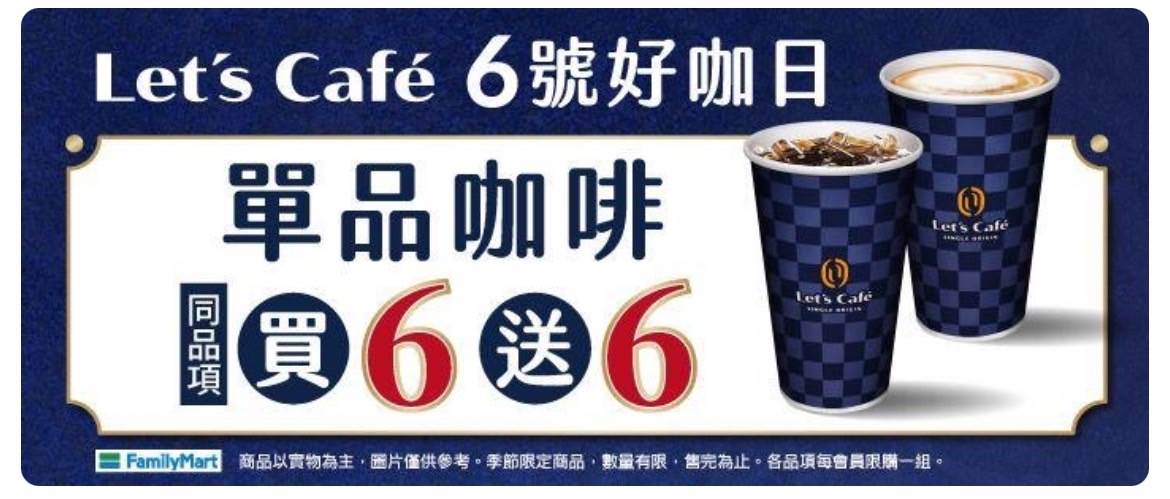 此外,全家明(6日)推出「好咖日」活動,於上午10點,使用APP「全家便利商店」購買,即可享有中/大杯單品美式、中/大杯單品拿鐵買6送6優惠,提醒有需要的人,手刀訂鬧鐘搶購。
