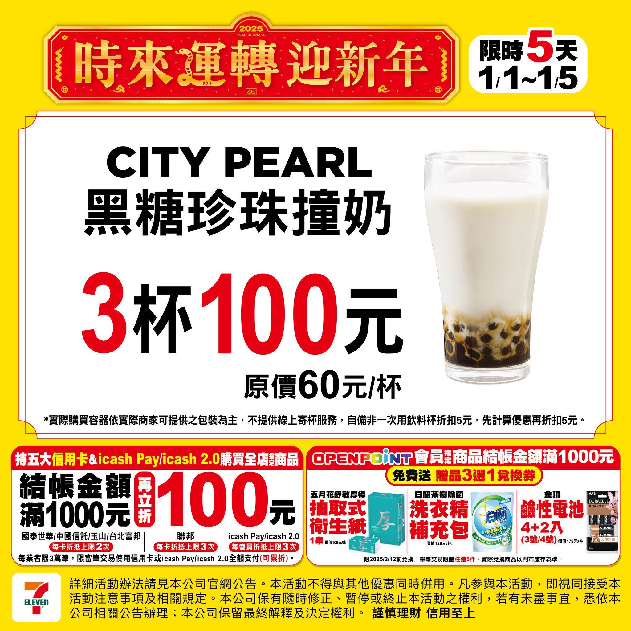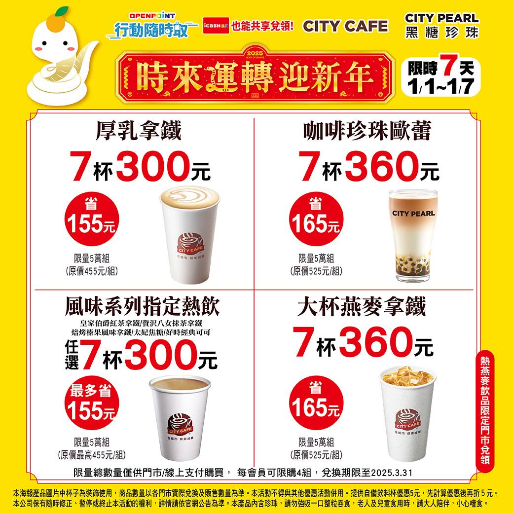 即日起至1月7日,於7-11APP「OPEN POINT」中購買優惠品項,即可享有優惠,包括厚乳拿鐵7杯300元、咖啡珍珠歐蕾7杯360元、大杯燕麥拿鐵7杯360元、風味系列指定熱飲(伯爵紅茶拿鐵/抹茶/焙烤榛果/太妃焦糖/好時經典可可)7杯300元,值得注意的是,每會員限購4組,有需要的人快打開手機訂購吧。
