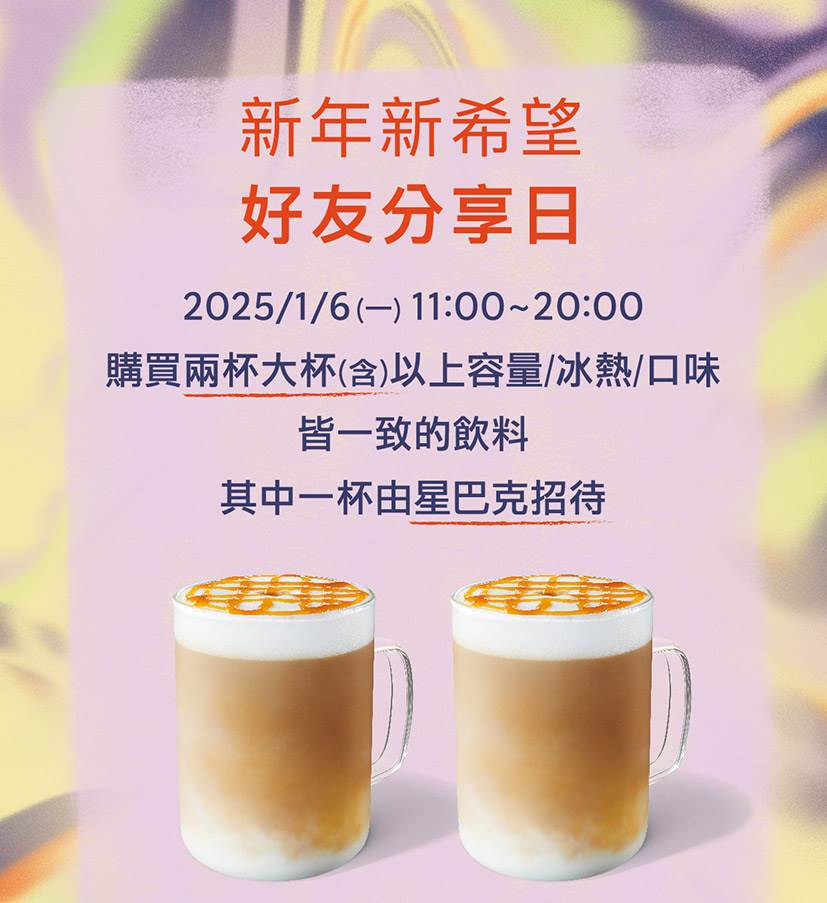 星巴克歡慶2025新年新希望,推出「好友分享日」活動,僅限定1月6日上午11時至晚間8時,至門市購買大杯以上容量,即可享有買一送一優惠,優惠品項以星巴克官網公告為主。