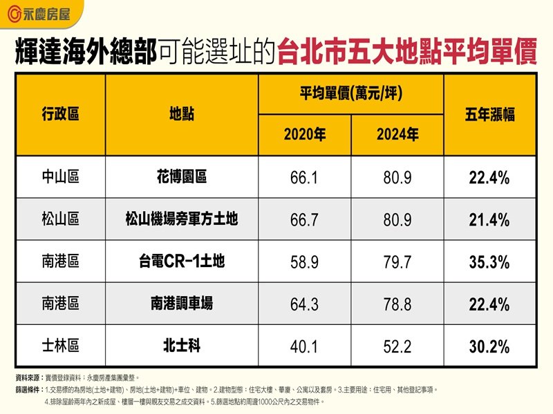 輝達海外總部可能選址的台北市五大地點平均單價。(永慶提供)