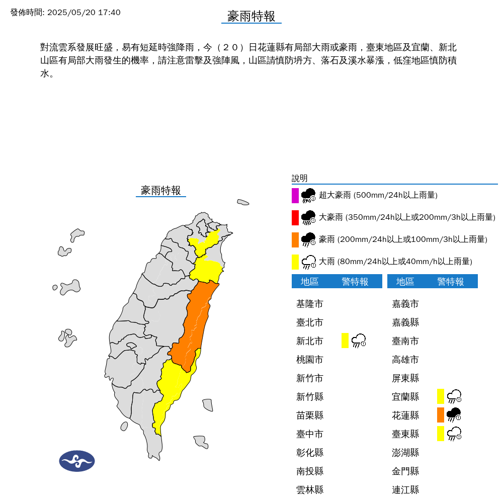 氣象署指出,對流雲系發展旺盛,易有短延時強降雨,今日花蓮縣有局部大雨或豪雨,臺東地區及宜蘭、新北山區有局部大雨發生的機率,請注意雷擊及強陣風,山區請慎防坍方、落石及溪水暴漲,低窪地區慎防積水。