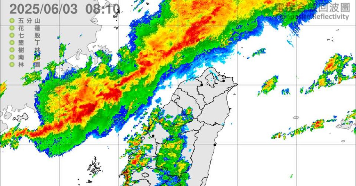 受滯留鋒面影響,今、明兩日台灣各地易出現短延時強降雨。前氣象局局長鄭明典今(3)日在臉書貼出最新雷達回波圖,指出一組線狀對流系統正快速接近,並提醒民眾應同步觀察閃電訊號。