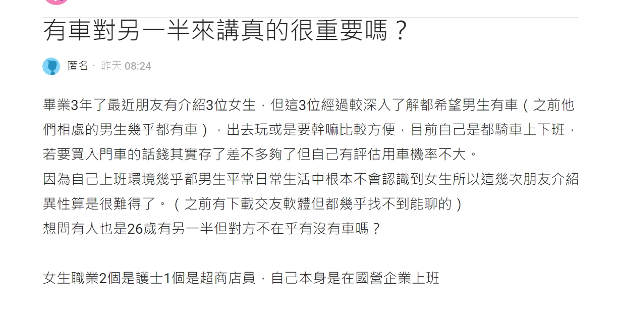 有車才能脫單?一名年輕男子分享自己認識3名妹子的過程,發現他們的交往條件都是「要有車」,讓他好奇「有車對另一半來講真的很重要嗎?」
