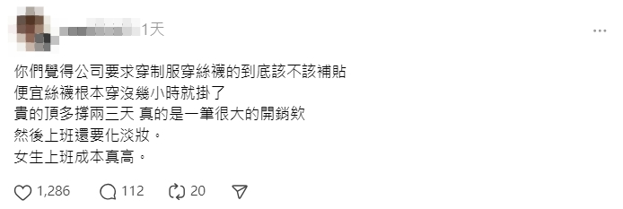貼文曝光後,網友們紛紛留言,「如果是納入制服規定的,那應該要算在制服費用裡面」、「個人覺得要公司補助,看工作性質吧!若是工作時間內,長時間久站,那就真的要求補助,因為長時間久站,容易產生靜脈曲張,至於絲襪,建議購回先放冰箱冷凍庫,至少半天最好一天,可讓絲襪更耐穿不脫絲」、「換工作」、「支持妳向公司提出建議,不合理就該反應改善」、「可以跟公司爭取,絲襪貧窮」。