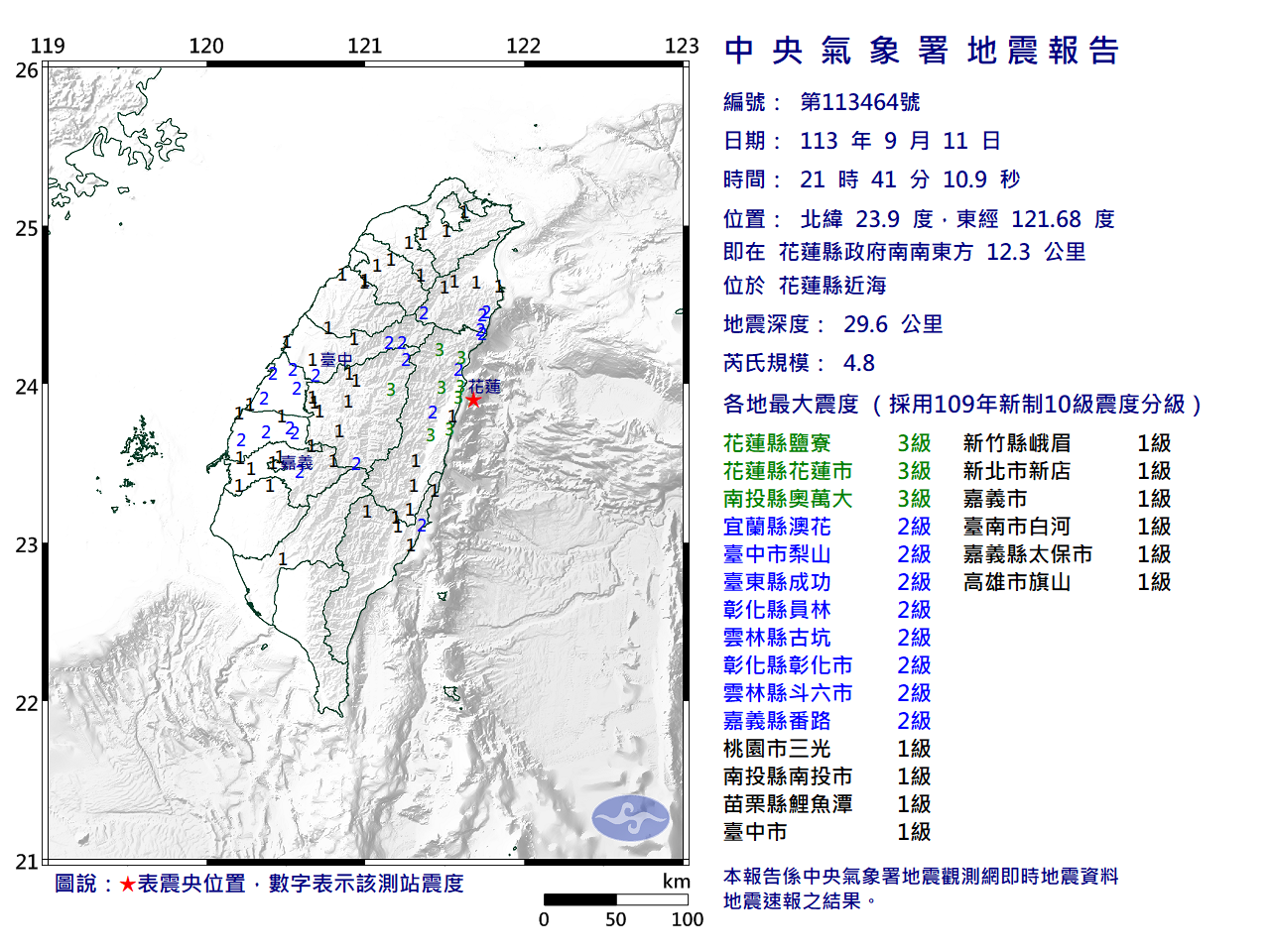 氣象署發布地震報告,9月11日21時41分發生有感地震,震央位於花蓮縣近海(即花蓮縣政府南南東方12.3公里),地震深度29.6公里,芮氏規模4.8。