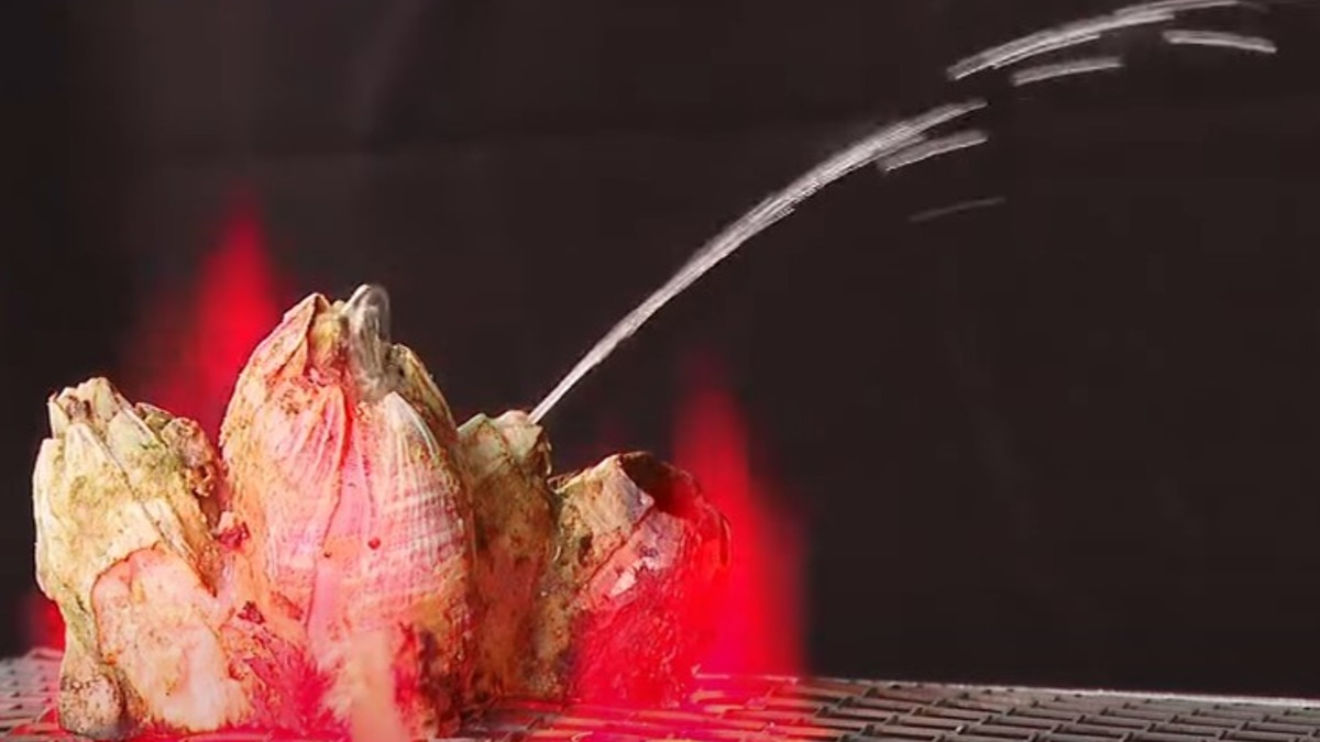 放上烤網轉大火,洞口朝上冒煙,立刻飄出新鮮海味。驚人的是,藤壺竟然還會噴水!只烤短短幾分鐘,就噴出高溫湯汁。原來夏天盛產藤壺,產地在東北角及澎湖,淺海海域。肉質細膩,吃起來帶有蟹肉香。民眾:「看起來有點奇怪,它是…這可以吃嗎?」