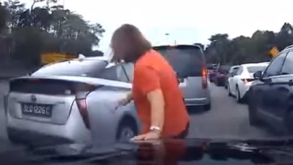 開車為了插隊卻有人上演離譜行徑!新加坡與馬來西亞邊界,一名婦人不要命地用肉身攔車,目的是要讓她所搭乘的車輛硬插進排隊的車龍中。這段影片曝光後,誇張又危險的行徑也遭到炮轟。