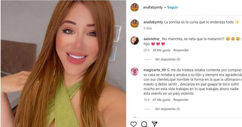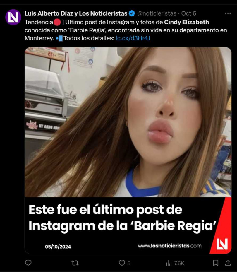 報導稱,36歲的辛蒂居住在蒙特雷(Monterrey),在網路上使用另一個名字「安娜法碧歐拉」(Ana Fabiola)發文。她在4日時因為未準時前往幼兒園,把3歲的兒子接回家,等到警方破門而入時,發現辛蒂全身赤裸躺在床上,已氣絕多時,頸部被刀刺傷,大量失血,身體其他部位也有傷勢,臉部則是被枕頭蓋住。