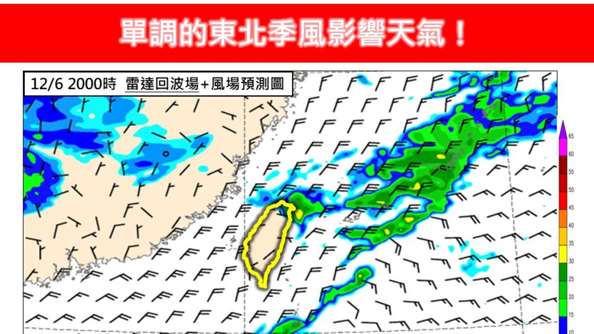 進入夜晚後,降雨範圍將擴大,提醒民眾若早出晚歸記得攜帶雨具,對此,氣象專家林得恩也在臉書「林老師氣象站」中提到,今日天氣持續受到東北季風影響,迎風面的北部及東北部地區愈晚降雨愈明顯,並請留意局部較大雨勢的發生。