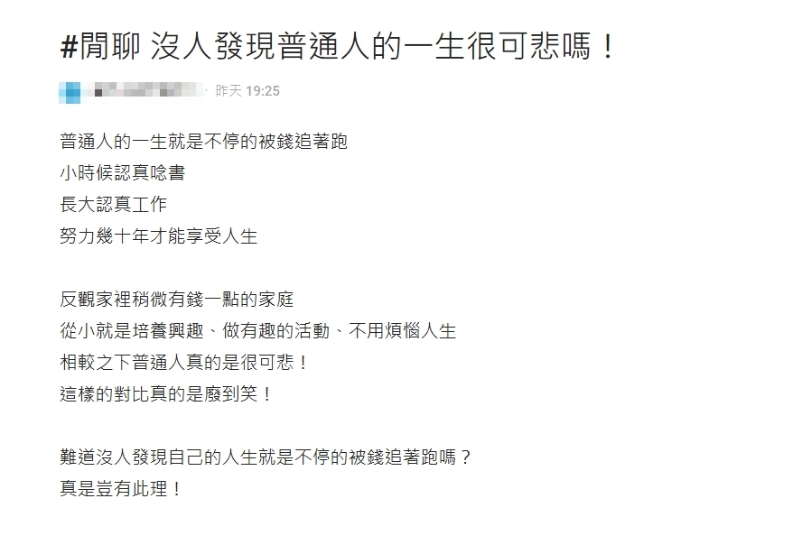 一名網友在Dcard上以「沒人發現普通人的一生很可悲嗎!」為題發文,表示普通人的一生就是不停的被錢追著跑,年幼認真唸書、長大認真工作,還要努力幾十年才能享受人生,但家境稍好的人,從小卻不用煩惱人生,讓原PO感嘆「相較之下普通人真的是很可悲,難道沒人發現自己的人生就是不停的被錢追著跑嗎?」