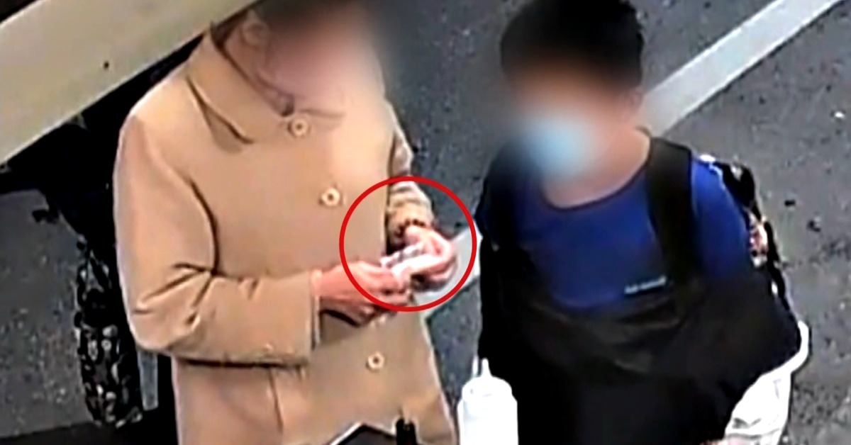 聖誕節當天身穿米色大衣的婦人,帶著小孩上門光顧買晚餐,先是點了一份百元豬排,又抱怨老闆娘怎麼什麼都漲,付錢時掏了一張500元給老闆娘,不過當老闆娘低頭找個錢,婦人卻像瞬間失憶。