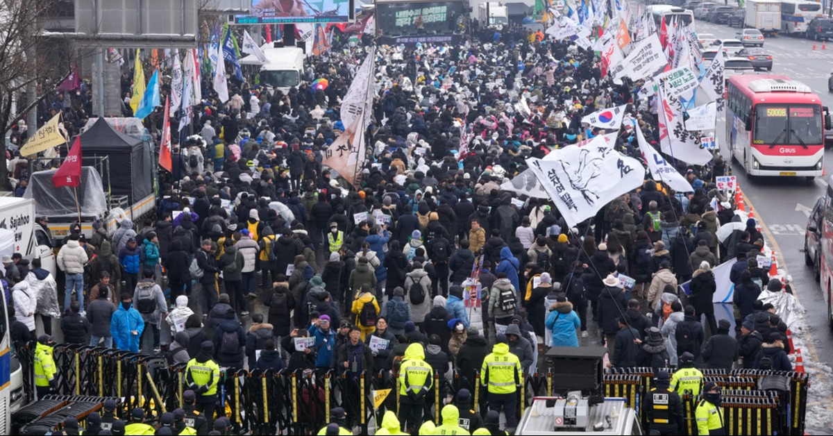 無懼風雪,挺尹、反尹人潮撐傘、披著鋁箔毯上街示威,南韓5日周日中午雪停後,挺尹、反尹人潮快速大集合,迅速佔據大馬路,兩派人馬距離只有3百多公尺,以聲勢較勁,大呼口號嗆聲。擔心兩方一觸即發,警方調來警巴築成車牆、拉起柵欄,加派警員圍成人牆,反光背心格外突出。