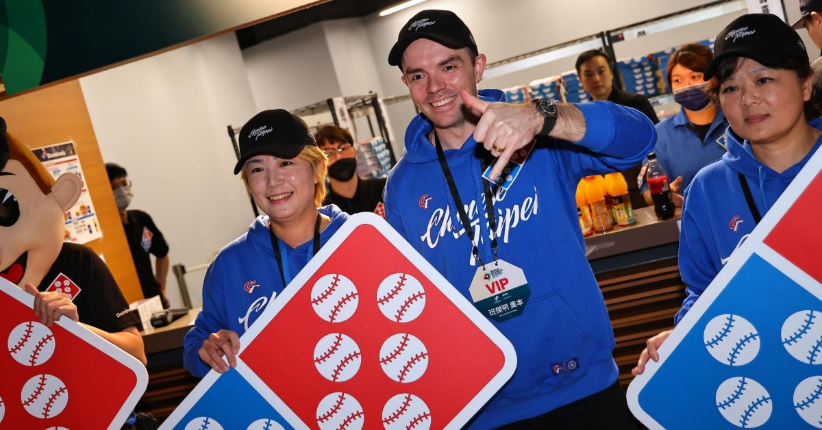 達美樂執行長班傑明奧本帶著「雙6」LOGO到中華隊大戰西班牙隊現場,來為中華隊加油打氣。(圖/翻攝自達美樂官方Threads)