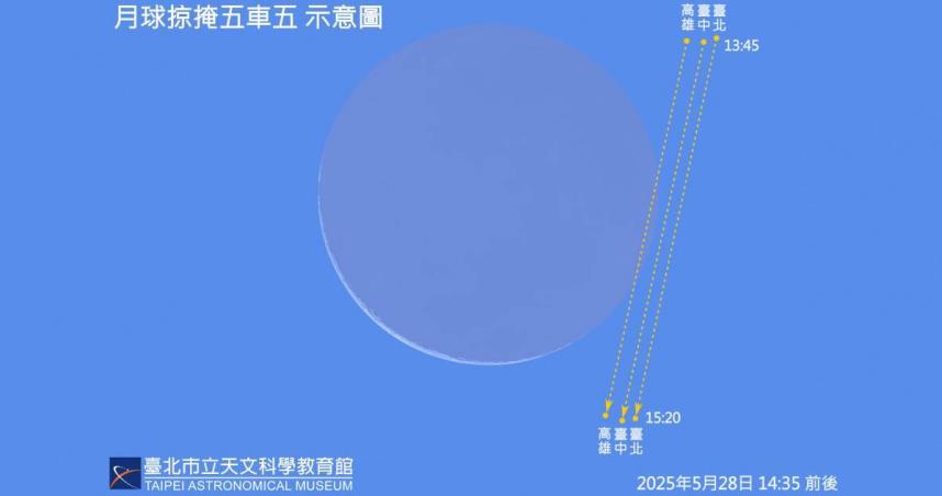 難得天象明(28)日登場!明日下午2時35分前後,將出現罕見的「月掩一等星」天象。台北市天文館提醒,台南以南地區的民眾,可觀察到金牛座五車五被月球遮掩,而台南與台東間則有機會觀察到五車五被月球「掠掩」的奇景。