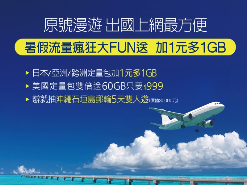 即日起,暢玩亞洲日、韓、泰、越、新、馬等熱門旅遊國家享指定方案加1元多1GB,上網需求量大也可選擇吃到飽方案一天99元起 ; 赴美旅遊或暑假短期遊學首選美國定量包60GB促銷價999元,使用天數30天,平均一天17元,真正破盤價超級划算。跨洲定量包12GB 990元,涵蓋97國,暢玩歐洲多國或有轉機需求一包就能滿足免煩惱。立即申辦漫遊上網方案,就有機會抽中沖繩石垣島郵輪5天雙人遊(價值30,000元)!在碧海藍天間盡享悠閒假期,為暑假留下最難忘的回憶。