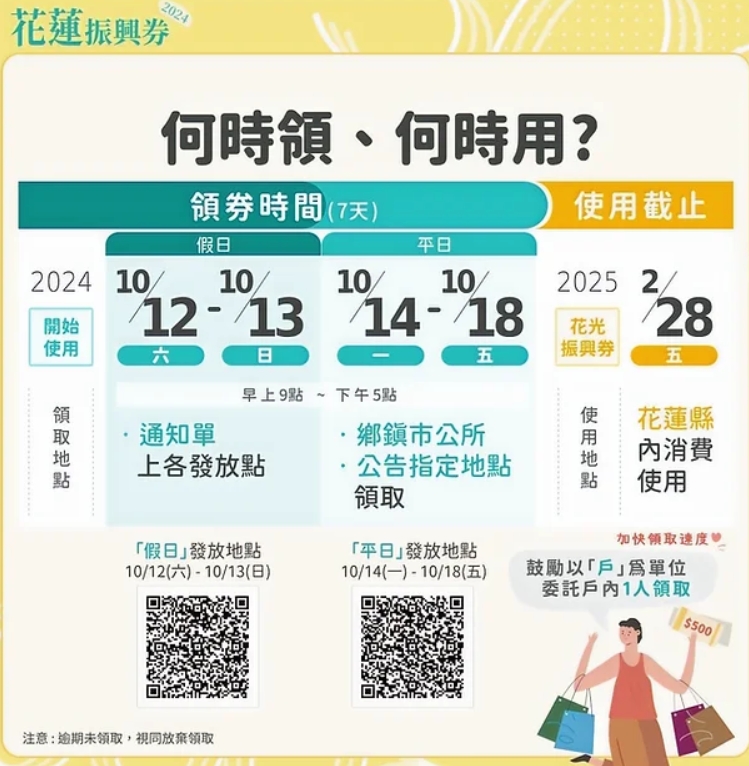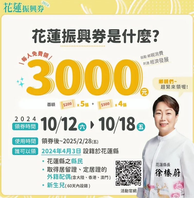 花蓮縣政府表示,希望透過這些措施來吸引更多消費,促進經濟成長。根據公告,領取資格包括113年4月3日之前在花蓮縣設籍的縣民,持有居留證或定居證且居住在花蓮的外籍配偶,以及在基準日之前出生但尚未列冊設籍的新生兒。