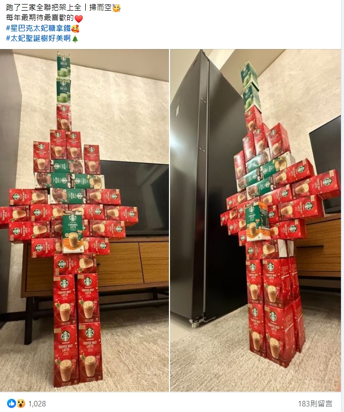 一名網友在臉書社團「我愛全聯-好物老實説」中發文表示,「她跑了三家全聯將架上的『星巴克太妃糖拿鐵』全一掃而空」隨後附上她將所有掃貨的商品擺設成聖誕樹的照片,就有民眾回應,「概略算差不多52盒,這顆樹應該5張到6張以上,妳真的太瘋狂。」