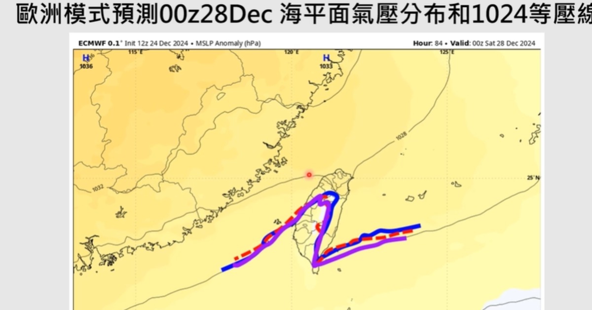 賈新興提到,跨年夜(31日)至元旦(1日)都將受東北季風增強影響,北海岸、 基隆、東北角至宜花有零星短暫雨發生的機率。到了2日午後至3日又將再受一波大陸冷氣團影響,桃園以北及宜花東,高屏亦有局部短暫雨。
