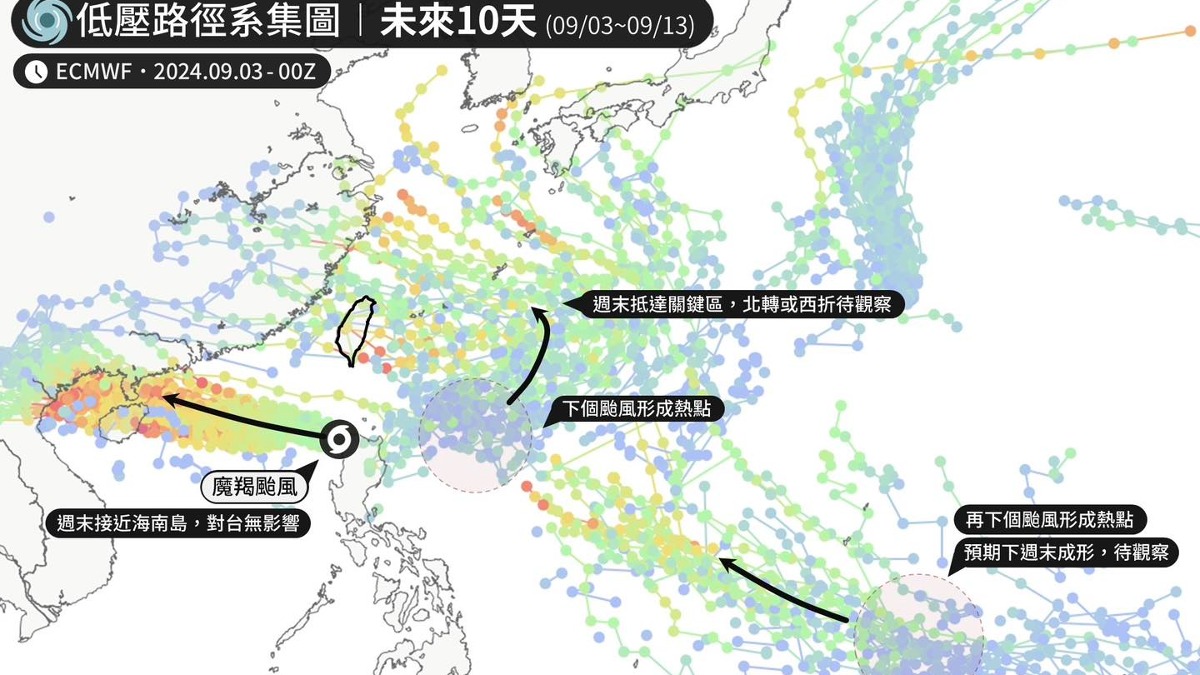 摩羯颱風雖然遠離,並無直接影響台灣,不過有氣象粉專指出,西太平洋依舊熱鬧,根據模式預報顯示,未來恐還有1、2個颱風形成。